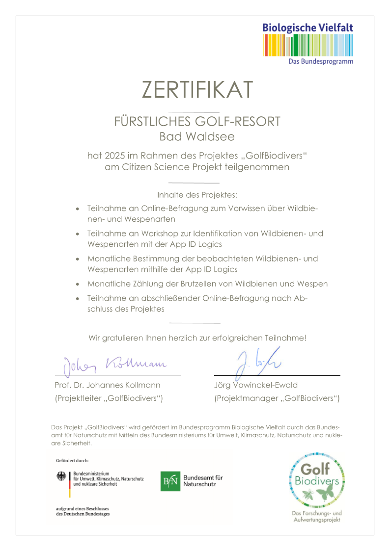 Wir sind stolz: Das Fürstliche Golf-Resort Bad Waldsee wurde im Rahmen des bundesweiten Projekts „GolfBiodivers“ zertifiziert!